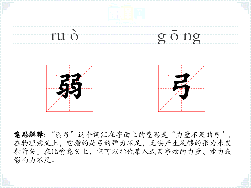 “弱弓”这个词汇在字面上的意思是“力量不足的弓”。在物理意义上,它指的是弓的弹力不足,无法产生足够的张力来发射箭矢。在比喻意义上,它可以指代某人或某事物的力量、能力或影响力不足。