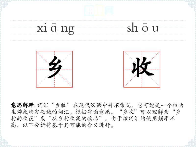 词汇“乡收”在现代汉语中并不常见,它可能是一个较为生僻或特定领域的词汇。根据字面意思,“乡收”可以理解为“乡村的收获”或“从乡村收集的物品”。由于该词汇的使用频率不高,以下分析将基于其可能的含义进行。