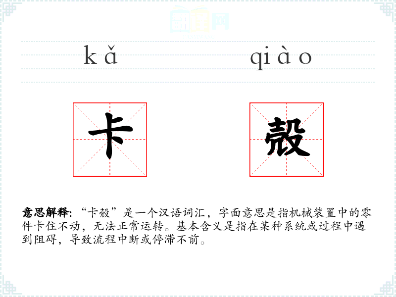 “卡殻”是一个汉语词汇,字面意思是指机械装置中的零件卡住不动,无法正常运转。基本含义是指在某种系统或过程中遇到阻碍,导致流程中断或停滞不前。