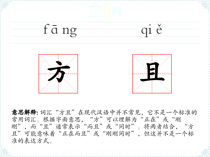 关于词源与演变,由于“方且”不是一个常用词汇,其历史演变和在语言中的变化不详。这个词可能是某些方言或特定文学作品中的创造性用法。