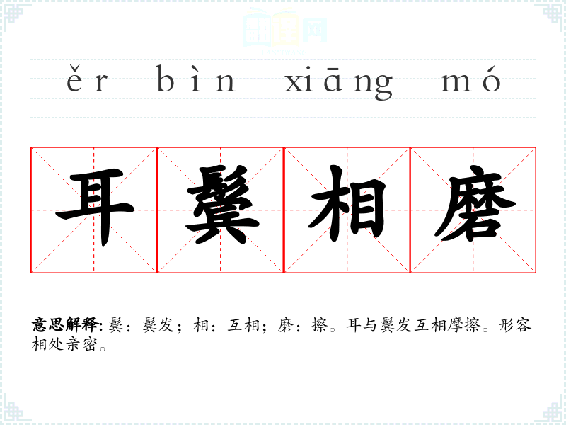 鬓:鬓发;相:互相;磨:擦。耳与鬓发互相摩擦。形容相处亲密。