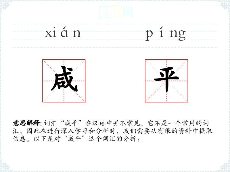 词汇“咸平”在汉语中并不常见,它不是一个常用的词汇,因此在进行深入学*和分析时,我们需要从有限的资料中提取信息。以下是对“咸平”这个词汇的分析: