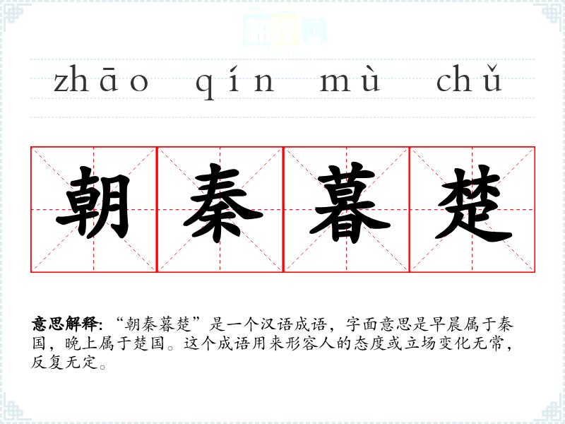 “朝秦暮楚”是一个汉语成语,字面意思是早晨属于秦国,晚上属于楚国。这个成语用来形容人的态度或立场变化无常,反复无定。