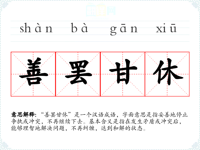 “善罢甘休”是一个汉语成语,字面意思是指妥善地停止争执或冲突,不再继续下去。基本含义是指在发生矛盾或冲突后,能够理智地解决问题,不再纠缠,达到和解的状态。