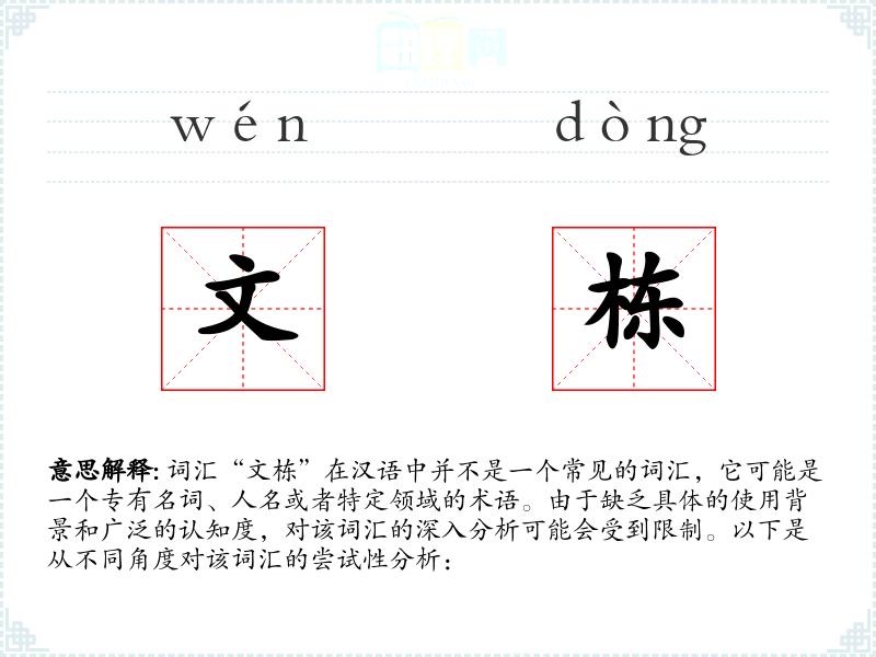 由于“文栋”不是一个常用词汇,它在不同语境下的使用可能非常有限。如果是一个专有名词,它可能出现在某个特定的文学作品、文化机构或历史建筑的名称中。