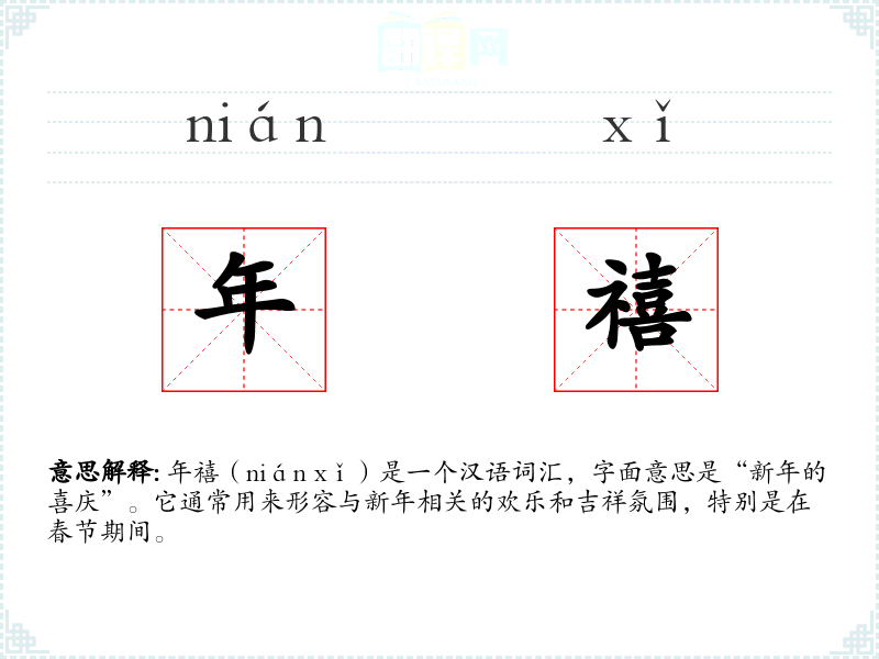 年禧(nián xǐ)是一个汉语词汇,字面意思是“新年的喜庆”。它通常用来形容与新年相关的欢乐和吉祥氛围,特别是在春节期间。