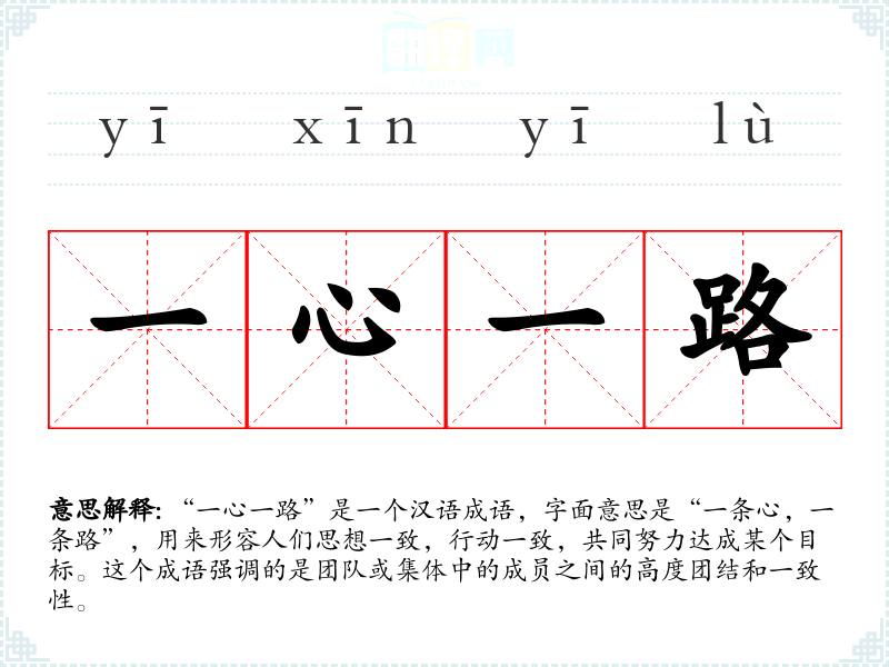 “一心一路”是一个汉语成语,字面意思是“一条心,一条路”,用来形容人们思想一致,行动一致,共同努力达成某个目标。这个成语强调的是团队或集体中的成员之间的高度团结和一致性。