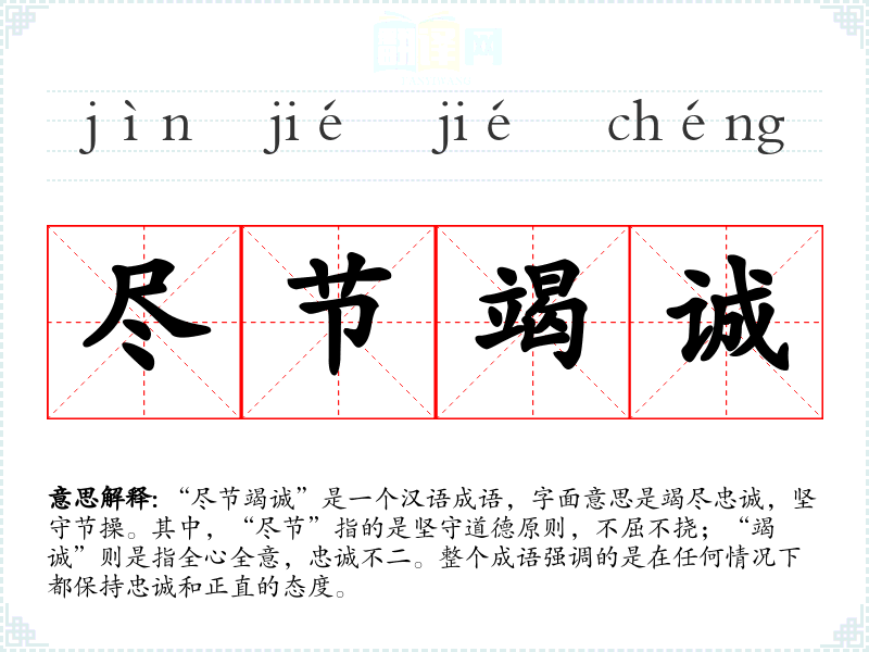 “尽节竭诚”是一个汉语成语,字面意思是竭尽忠诚,坚守节操。其中,“尽节”指的是坚守道德原则,不屈不挠;“竭诚”则是指全心全意,忠诚不二。整个成语强调的是在任何情况下都保持忠诚和正直的态度。