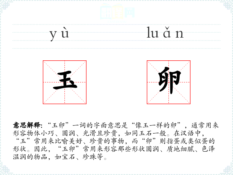 “玉卵”一词的字面意思是“像玉一样的卵”,通常用来形容物体小巧、圆润、光滑且珍贵,如同玉石一般。在汉语中,“玉”常用来比喻美好、珍贵的事物,而“卵”则指蛋或类似蛋的形状。因此,“玉卵”常用来形容那些形状圆润、质地细腻、色泽温润的物品,如宝石、珍珠等。