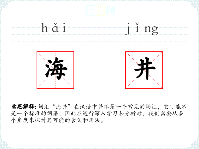 词汇“海井”在汉语中并不是一个常见的词汇,它可能不是一个标准的词语,因此在进行深入学*和分析时,我们需要从多个角度来探讨其可能的含义和用法。