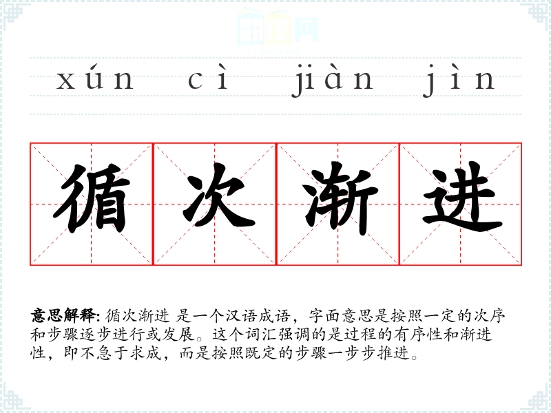循次渐进 这个词汇在我语言学和表达中非常重要,它不仅指导我如何有序地进行学和工作,也帮助我在面对复杂问题时保持冷静和有条不紊的态度。通过深入学*和分析这个词汇,我更加理解了其在不同语境中的应用和重要性。