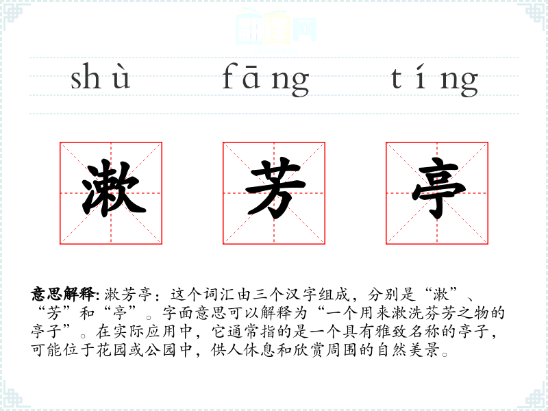 漱芳亭:这个词汇由三个汉字组成,分别是“漱”、“芳”和“亭”。字面意思可以解释为“一个用来漱洗芬芳之物的亭子”。在实际应用中,它通常指的是一个具有雅致名称的亭子,可能位于花园或公园中,供人休息和欣赏周围的自然美景。