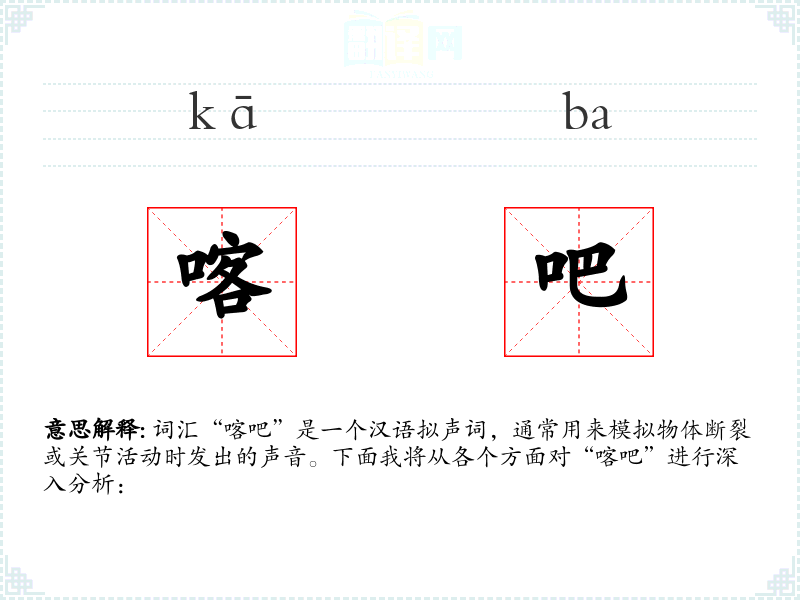词汇“喀吧”是一个汉语拟声词,通常用来模拟物体断裂或关节活动时发出的声音。下面我将从各个方面对“喀吧”进行深入分析:
