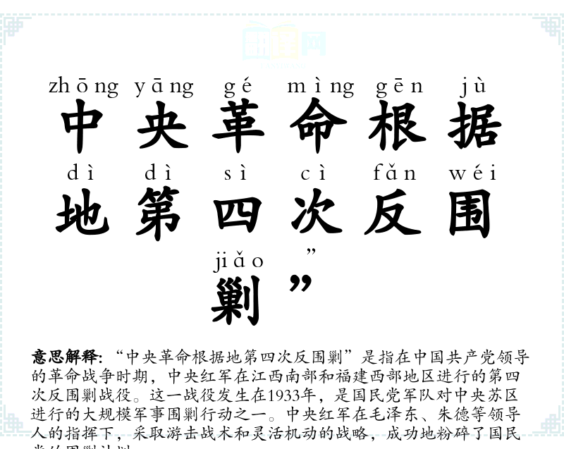 “中央革命根据地第四次反围剿”是一个具有深远历史意义和文化价值的词汇。它不仅描述了一个特定的军事行动,还承载了*人民在特定历史时期的斗争精神和革命理想。在语言学和表达中,了解这样的词汇有助于更深入地理解历史和文化背景。