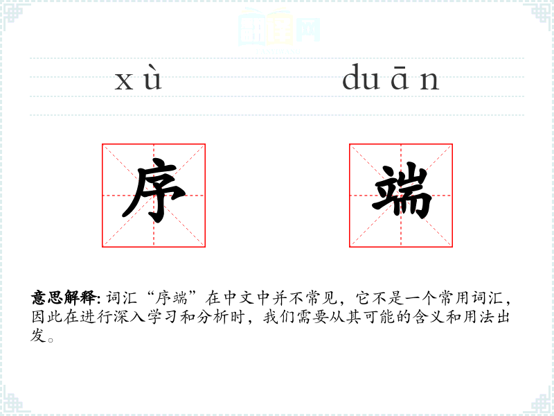 “序端”字面意思是指“序言的开端”或“开始的部分”。在这里,“序”通常指的是书籍、文章或演讲前的介绍性文字,而“端”则指的是开始或起始点。