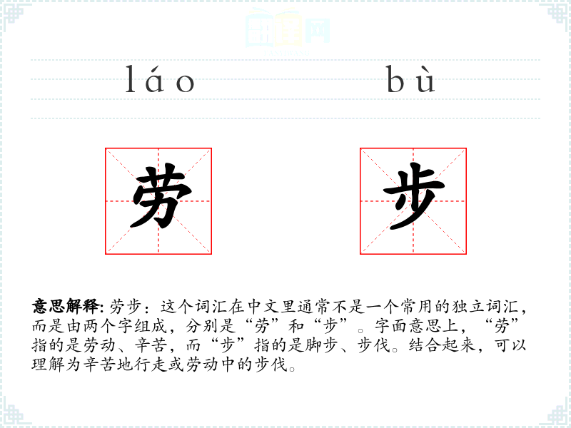 劳步:这个词汇在中文里通常不是一个常用的独立词汇,而是由两个字组成,分别是“劳”和“步”。字面意思上,“劳”指的是劳动、辛苦,而“步”指的是脚步、步伐。结合起来,可以理解为辛苦地行走或劳动中的步伐。
