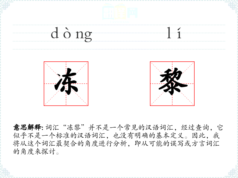 由于“冻黎”不是一个标准的汉语词汇,我们无法给出其字面意思和基本含义。它可能是某个方言中的词汇,或者是某个特定社群中的俚语,但在普通话中并不常见。