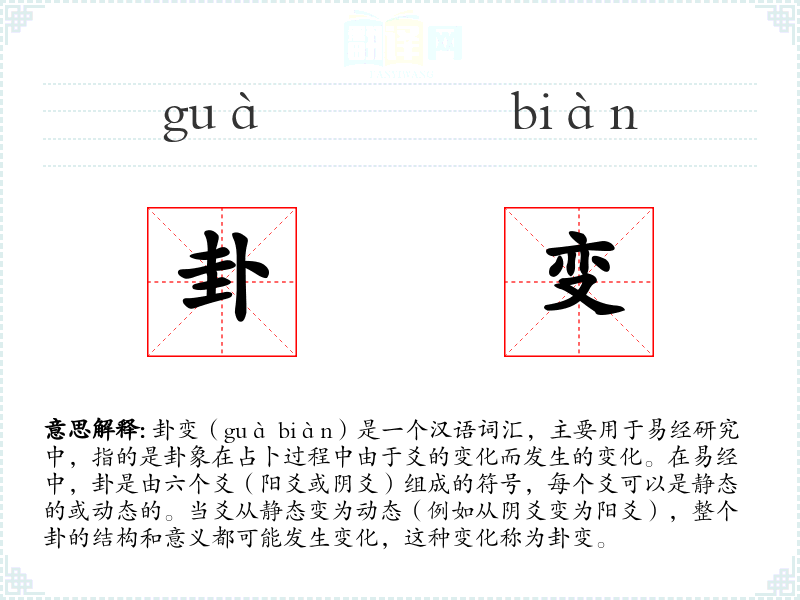 - 口语:在日常口语中,卦变可能不常被提及,除非是在讨论易经或占卜相关的话题。