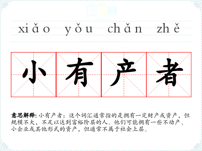 小有产者:这个词汇通常指的是拥有一定财产或资产,但规模不大,不足以达到富裕阶层的人。他们可能拥有一些不动产、小企业或其他形式的资产,但通常不属于社会上层。