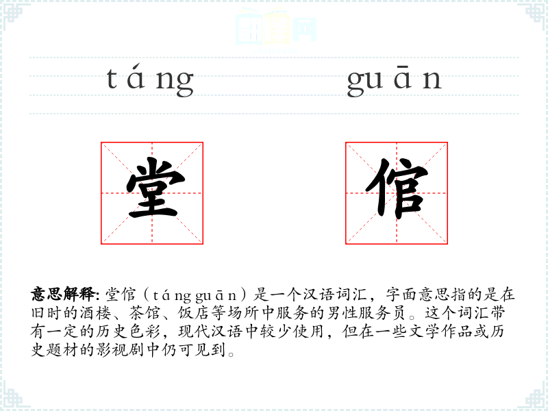 堂倌(táng guān)是一个汉语词汇,字面意思指的是在旧时的酒楼、茶馆、饭店等场所中服务的男性服务员。这个词汇带有一定的历史色彩,现代汉语中较少使用,但在一些文学作品或历史题材的影视剧中仍可见到。