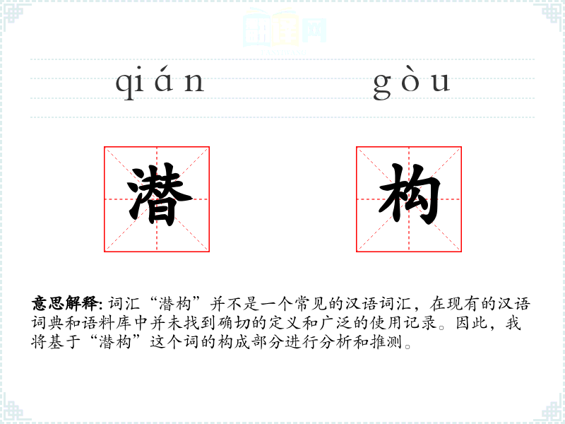 “潜构”由“潜”和“构”两个字组成。其中,“潜”通常指隐藏、不显露的状态,而“构”则有构建、构造的含义。结合这两个字,我们可以推测“潜构”可能指的是某种隐藏的、未显露的构造或构建过程。