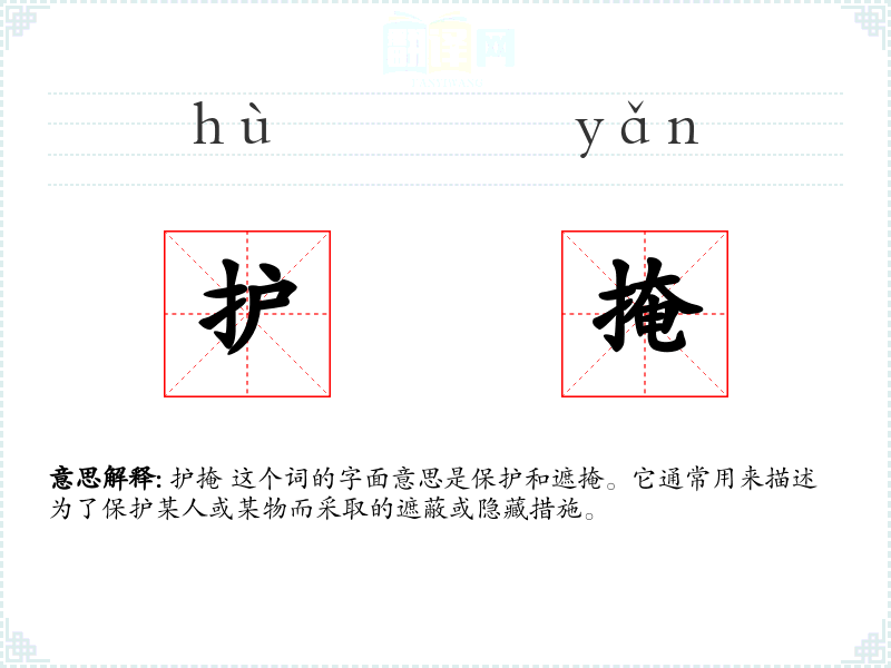 护掩 这个词的字面意思是保护和遮掩。它通常用来描述为了保护某人或某物而采取的遮蔽或隐藏措施。