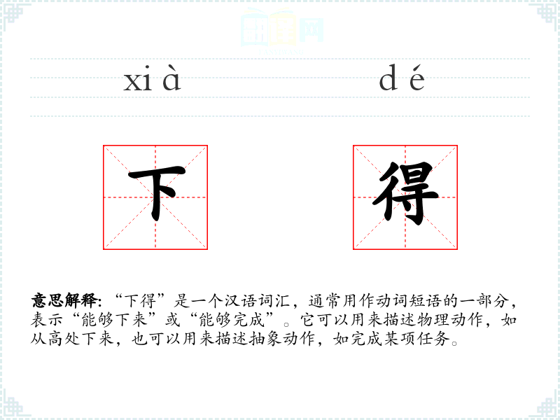 “下得”是一个汉语词汇,通常用作动词短语的一部分,表示“能够下来”或“能够完成”。它可以用来描述物理动作,如从高处下来,也可以用来描述抽象动作,如完成某项任务。