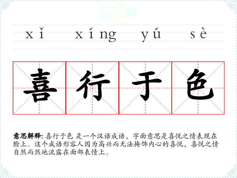 喜行于色 是一个汉语成语,字面意思是喜悦之情表现在脸上。这个成语形容人因为高兴而无法掩饰内心的喜悦,喜悦之情自然而然地流露在面部表情上。
