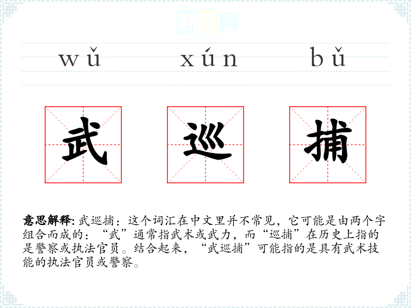 武巡捕:这个词汇在中文里并不常见,它可能是由两个字组合而成的:“武”通常指武术或武力,而“巡捕”在历史上指的是警察或执法官员。结合起来,“武巡捕”可能指的是具有武术技能的执法官员或警察。