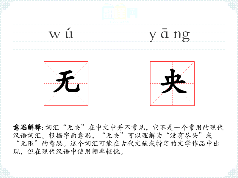 在其他语言中,可能没有直接对应“无央”的词汇,但类似的表达如“infinite”(无限)在英语中可以传达相似的概念。