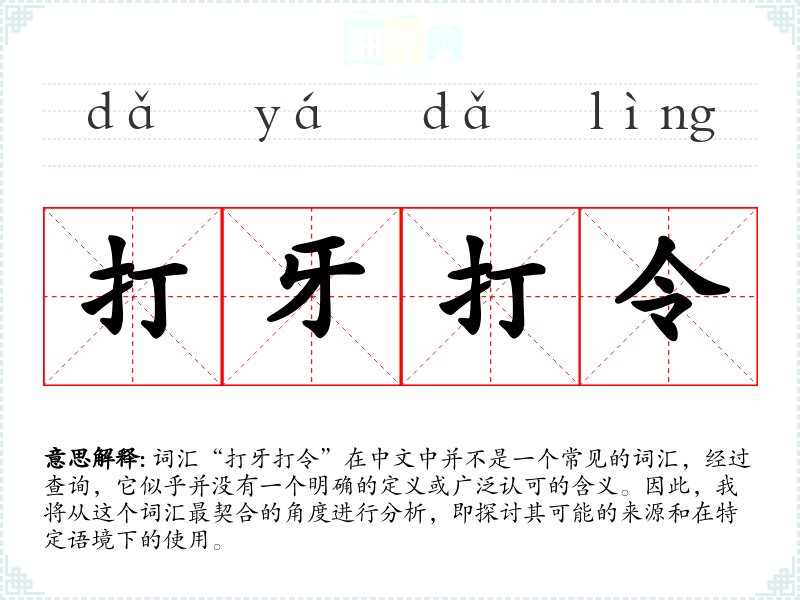 由于“打牙打令”不是一个标准词汇,我们无法给出一个确切的字面意思和基本含义。它可能是某个方言、俚语或者是特定社群中的用语,但没有广泛的文献或资料支持这一点。