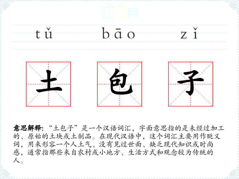 “土包子”是一个汉语词汇,字面意思指的是未经过加工的、原始的土块或土制品。在现代汉语中,这个词汇主要用作贬义词,用来形容一个人土气、没有见过世面、缺乏现代知识或时尚感,通常指那些来自农村或小地方、生活方式和观念较为传统的人。