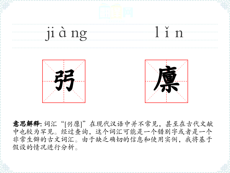 词汇“[弜廪]”在现代汉语中并不常见,甚至在古代文献中也较为罕见。经过查询,这个词汇可能是一个错别字或者是一个非常生僻的古文词汇。由于缺乏确切的信息和使用实例,我将基于假设的情况进行分析。