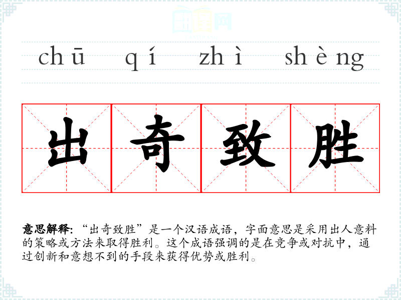 “出奇致胜”是一个汉语成语,字面意思是采用出人意料的策略或方法来取得胜利。这个成语强调的是在竞争或对抗中,通过创新和意想不到的手段来获得优势或胜利。