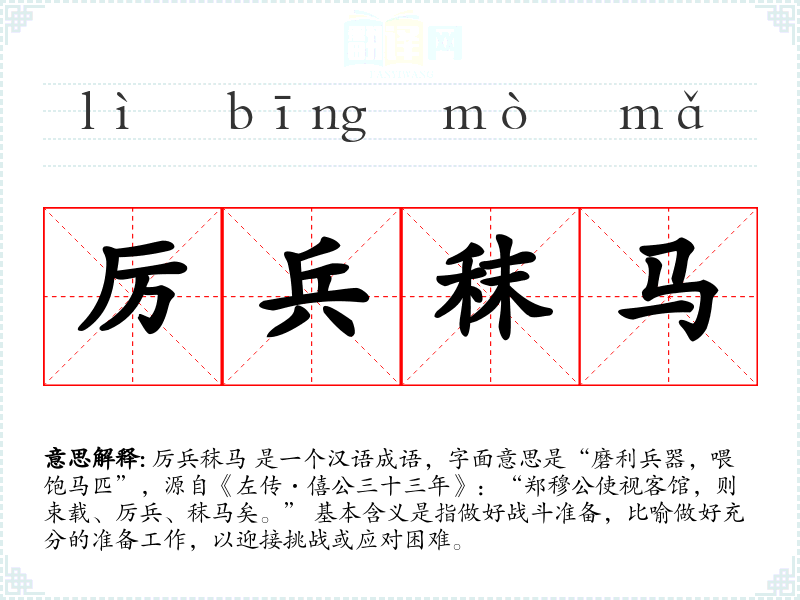 厉兵秣马 是一个汉语成语,字面意思是“磨利兵器,喂饱马匹”,源自《左传·僖公三十三年》:“郑穆公使视客馆,则束载、厉兵、秣马矣。” 基本含义是指做好战斗准备,比喻做好充分的准备工作,以迎接挑战或应对困难。
