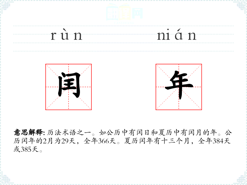历法术语之一。如公历中有闰日和夏历中有闰月的年。公历闰年的2月为29天,全年366天。夏历闰年有十三个月,全年384天或385天。