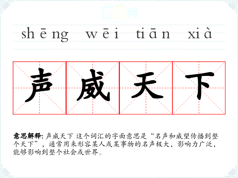 声威天下 这个词汇的字面意思是“名声和威望传播到整个天下”,通常用来形容某人或某事物的名声极大,影响力广泛,能够影响到整个社会或世界。