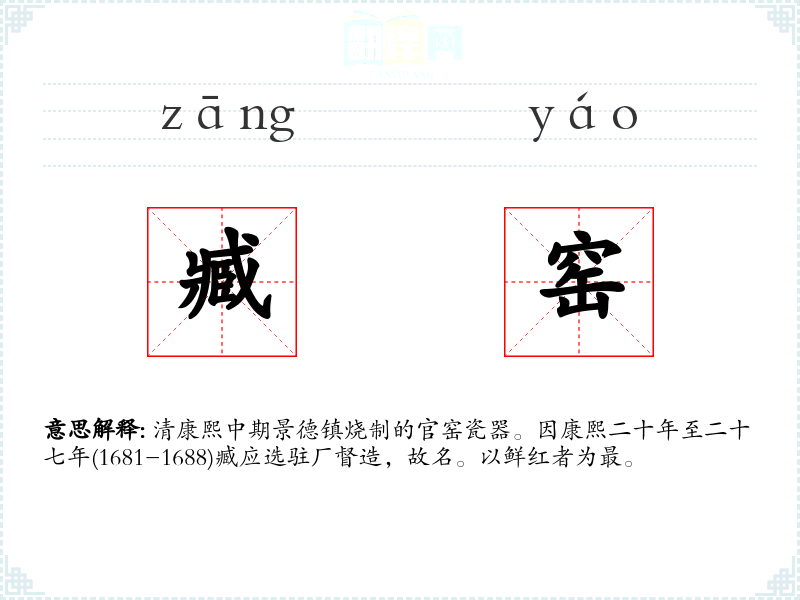 清康熙中期景德镇烧制的官窑瓷器。因康熙二十年至二十七年(1681-1688)臧应选驻厂督造,故名。以鲜红者为最。