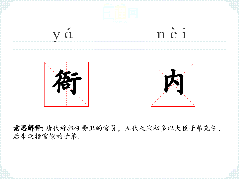 唐代称担任警卫的官员,五代及宋初多以大臣子弟充任,后来泛指官僚的子弟。