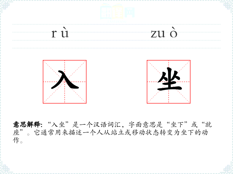 “入坐”是一个汉语词汇,字面意思是“坐下”或“就座”。它通常用来描述一个人从站立或移动状态转变为坐下的动作。