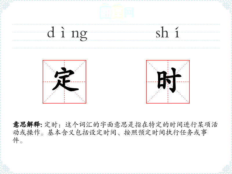 定时:这个词汇的字面意思是指在特定的时间进行某项活动或操作。基本含义包括设定时间、按照预定时间执行任务或**。