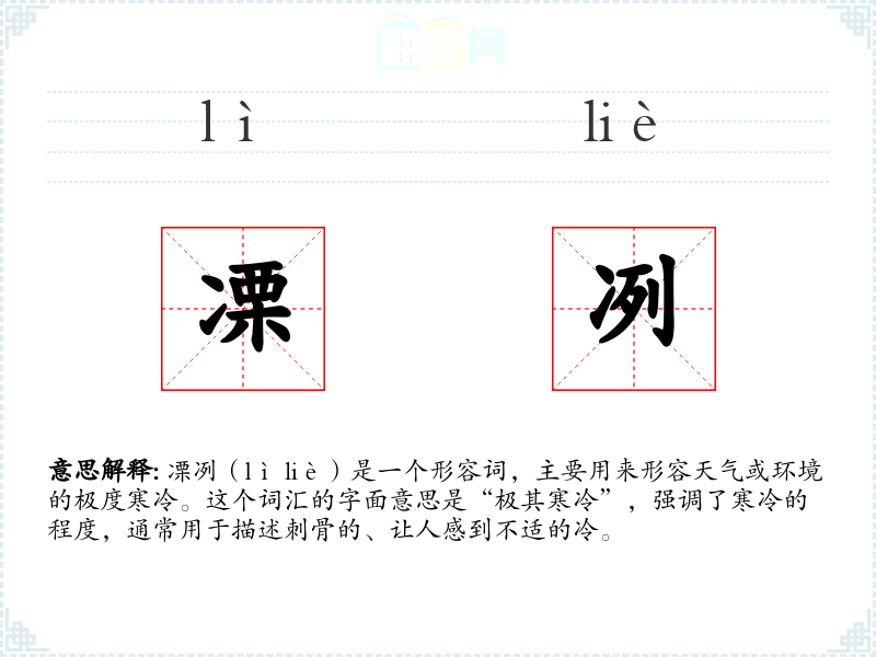 凓冽(lì liè)是一个形容词,主要用来形容天气或环境的极度寒冷。这个词汇的字面意思是“极其寒冷”,强调了寒冷的程度,通常用于描述刺骨的、让人感到不适的冷。
