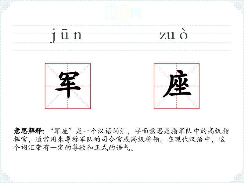 “军座”是一个汉语词汇,字面意思是指军队中的高级指挥官,通常用来尊称军队的司令官或高级将领。在现代汉语中,这个词汇带有一定的尊敬和正式的语气。