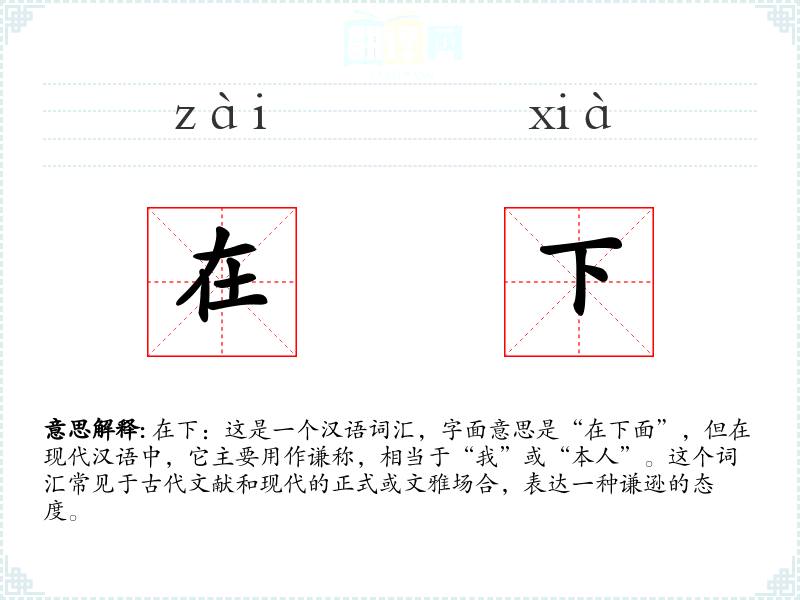 - 反义词:阁下、您、尊驾(这些词汇用于尊称对方,与“在下”的谦称形成对比)