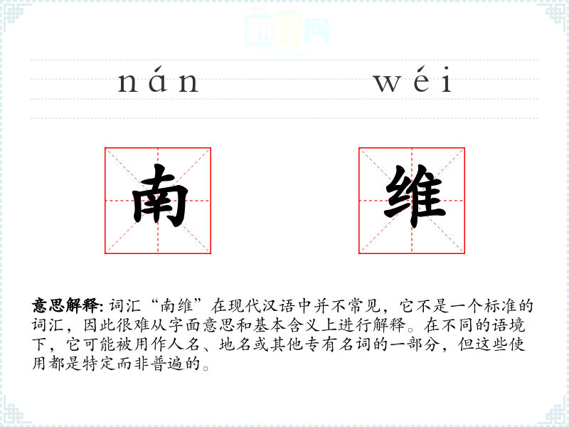 词汇“南维”在现代汉语中并不常见,它不是一个标准的词汇,因此很难从字面意思和基本含义上进行解释。在不同的语境下,它可能被用作人名、地名或其他专有名词的一部分,但这些使用都是特定而非普遍的。