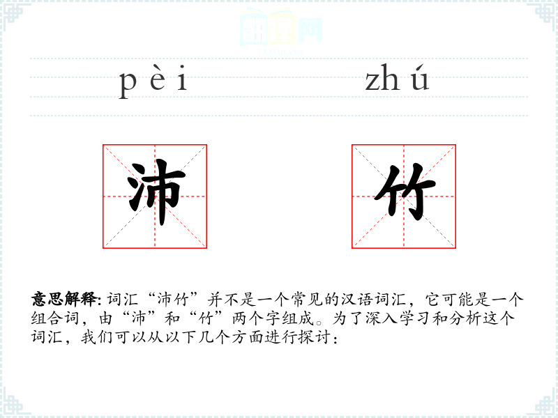 词汇“沛竹”并不是一个常见的汉语词汇,它可能是一个组合词,由“沛”和“竹”两个字组成。为了深入学*和分析这个词汇,我们可以从以下几个方面进行探讨: