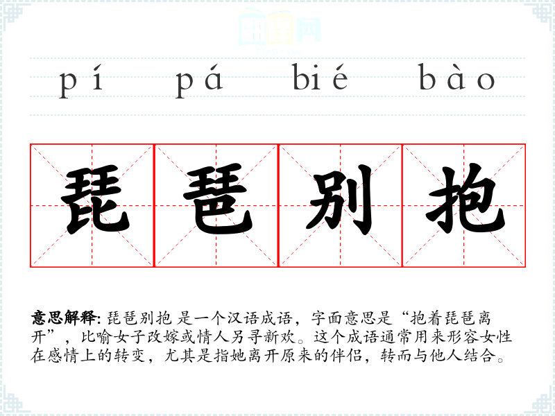 琵琶别抱 是一个汉语成语,字面意思是“抱着琵琶离开”,比喻女子改嫁或情人另寻新欢。这个成语通常用来形容女性在感情上的转变,尤其是指她离开原来的伴侣,转而与他人结合。