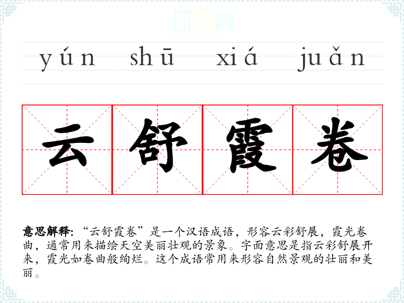 - 文学:在文学作品中,“云舒霞卷”常用来描绘自然景观,如诗歌、散文等,用以表达对自然美景的赞美和感慨。
