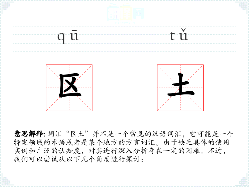 词汇“区土”并不是一个常见的汉语词汇,它可能是一个特定领域的术语或者是某个地方的方言词汇。由于缺乏具体的使用实例和广泛的认知度,对其进行深入分析存在一定的困难。不过,我们可以尝试从以下几个角度进行探讨: