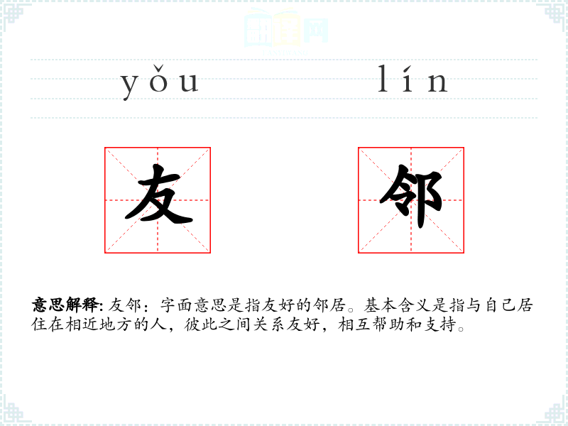 友邻:字面意思是指友好的邻居。基本含义是指与自己居住在相近地方的人,彼此之间关系友好,相互帮助和支持。